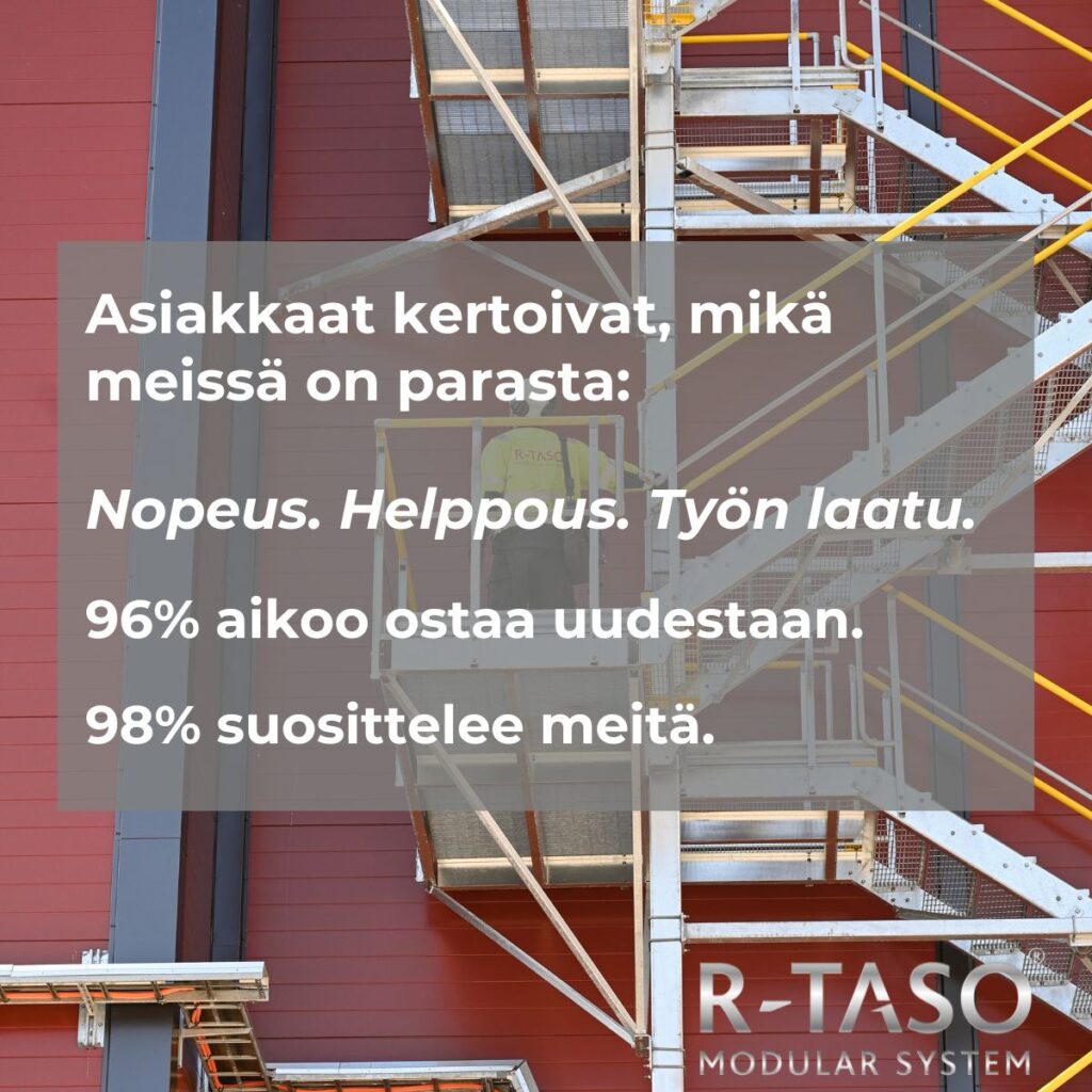 R‑tasolla asiakaskokemus ei ole erillinen osa palvelua – se on osa suunnittelua ja ihan jokaista toimitettua projektia. Viimeisin asiakastyytyväisyyskyselymme osoitti, että vahvuutemme loistavat juuri niissä asioissa, joihin panostamme joka päivä.